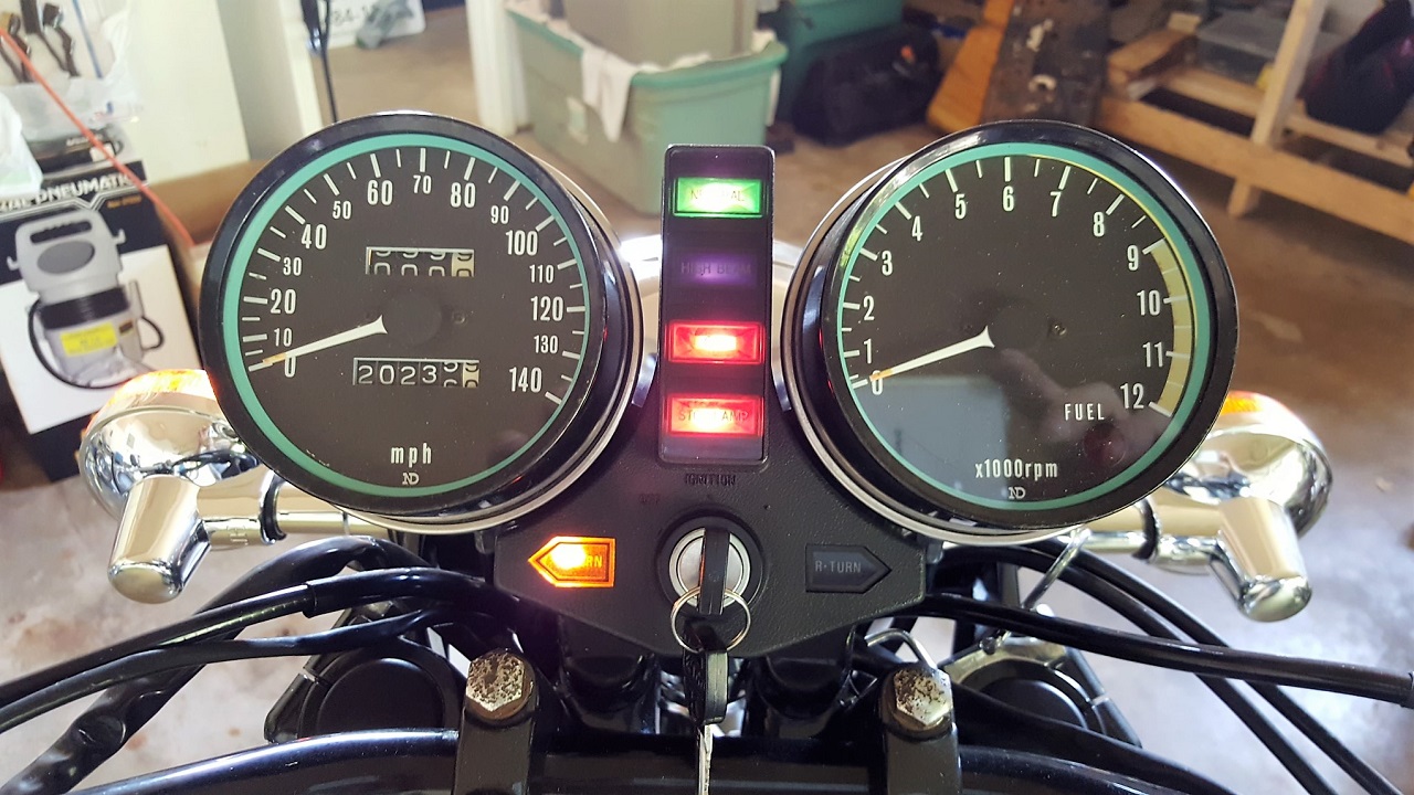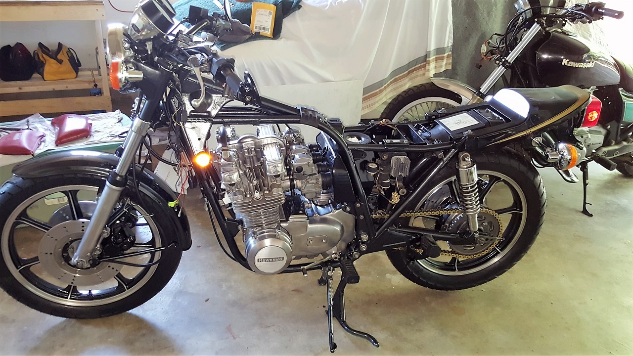 I had to replace the old flasher relays of course and new bulbs and a slight custom change to the front turn signals which are currently only signals and not running lights too. This will change later as I have the bulb holders that support both running and turn but the holders were not present when I found KZombie and so it's been a collecting of absent bits thing. The front turn signal housings are made for a late model (I think it said 90's era) Kawasaki so they look the same but must be for a European market.