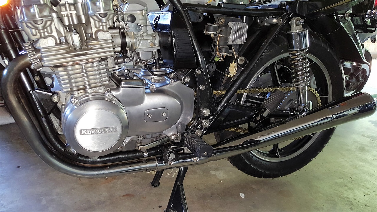 Serendipitous timing for a "1978 KZ650 exhaust system, complete", on the List Von Craig turned up in Austin recently and drove down and picked it up. Well, it was a good price I thought and original part and in pretty good shape. Truth be told, KZombie's mufflers looked better in the chrome department but these ones were functional and so I slapped them on: