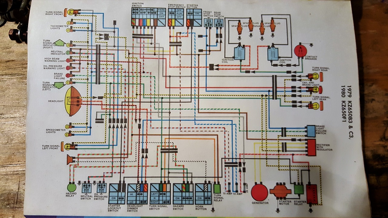 These wiring diagrams always make me feel smart but then the reality of the wiring loom makes me feel stupid. Compounding this whole mess is the inconsistencies found in these diagrams. I have three different manuals for KZombie - FSM, Clymer and Haynes. Every one of them has subtle but often as it turns out significant differences between them.