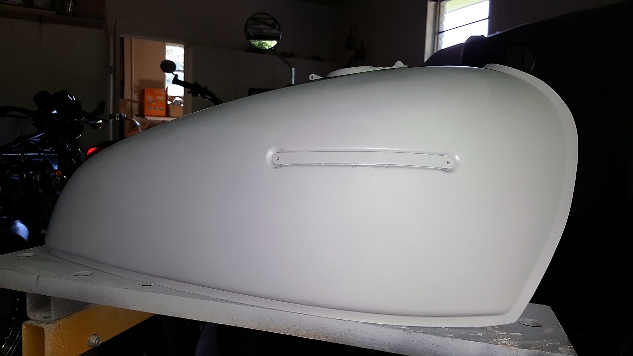 That picture there represents about five evenings of body working and block sanding on that tank. Geez, I hope it's worth it all in the end! By late week I was able to get the tank into primer and ready for color: