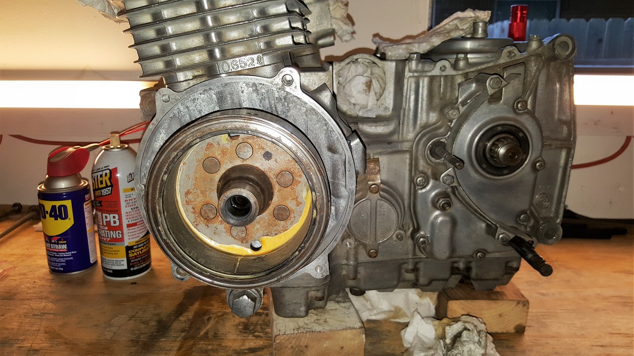 I could not for the life of me, get that rotor/flywheel off. I resisted the temptation to stuff a BF pry bar up in that shizzle and start banging it against the case sides for obvious reasons and over the course of the night spritzed quite a bit of PB down the threaded bore. Gently tapping the edges with the wood handle of my small hammer to hopefully get the oil to work-in. Ultimately though, I was never able to get that rotor off. My hands and fingers were suitably drenched in motor oil and penetrating oils by this point so I couldn't flip through the FSM but just knew in my heart some page deep inside was showing another famous Kawasaki Special Tool # blah blah blah, that I didn't have.
