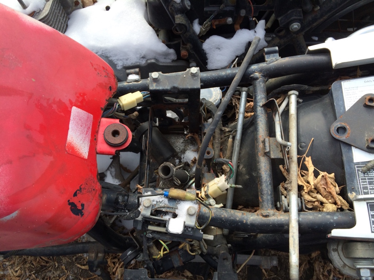 On my next trip back to the salvage yard, the tank was still in the same spot on the ground and covered with snow. So I found the one kz750e in the yard and set the kz1000 tank down on the frame and it almost fit like it belonged there.