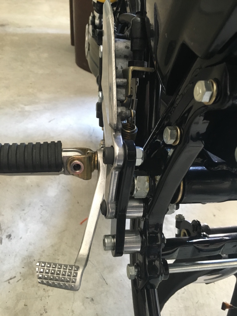 I ended up stripping the paint off the rearsets and polishing the aluminum. The rubber footpegs were replaced with ebay ones and the hardware I had re-zinc plated yellow just as it was from the factory. The brackets I had powder coated along with the frame. The zx600d shift linkage was way to long, but thankfully the shift rod from the zr550 is the perfect length.