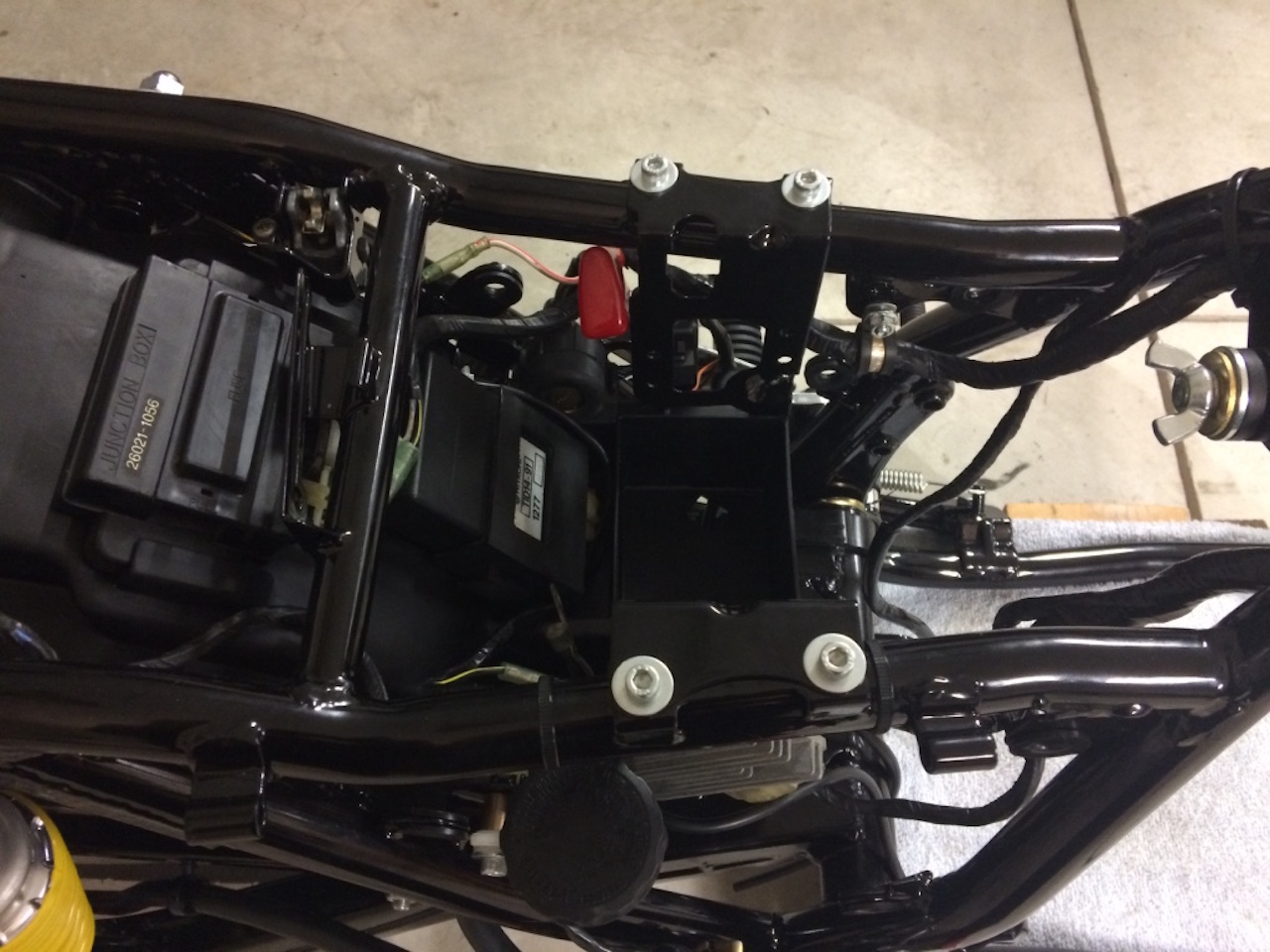 First I test fit the one-piece plastic battery box and electrical panel in the kz750 frame and it almost fit. I had to do some creative trimming of the plastic around the shock mounts and where it met the kz750 rear fender but it fit in really well. The battery box portion wasn’t braced at all, so I cut up the rusted stock battery box and used them as a cradle to support the weight of the battery