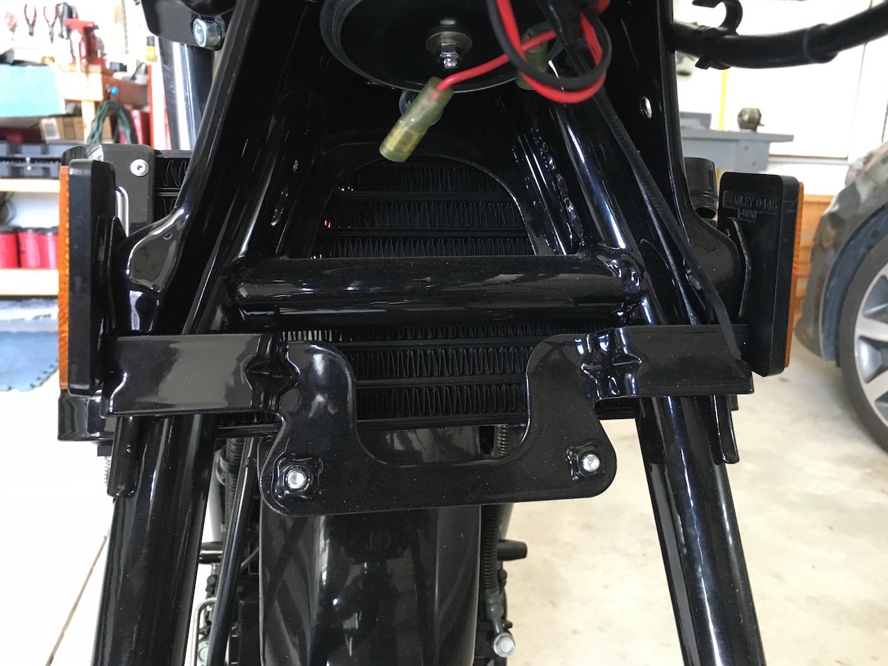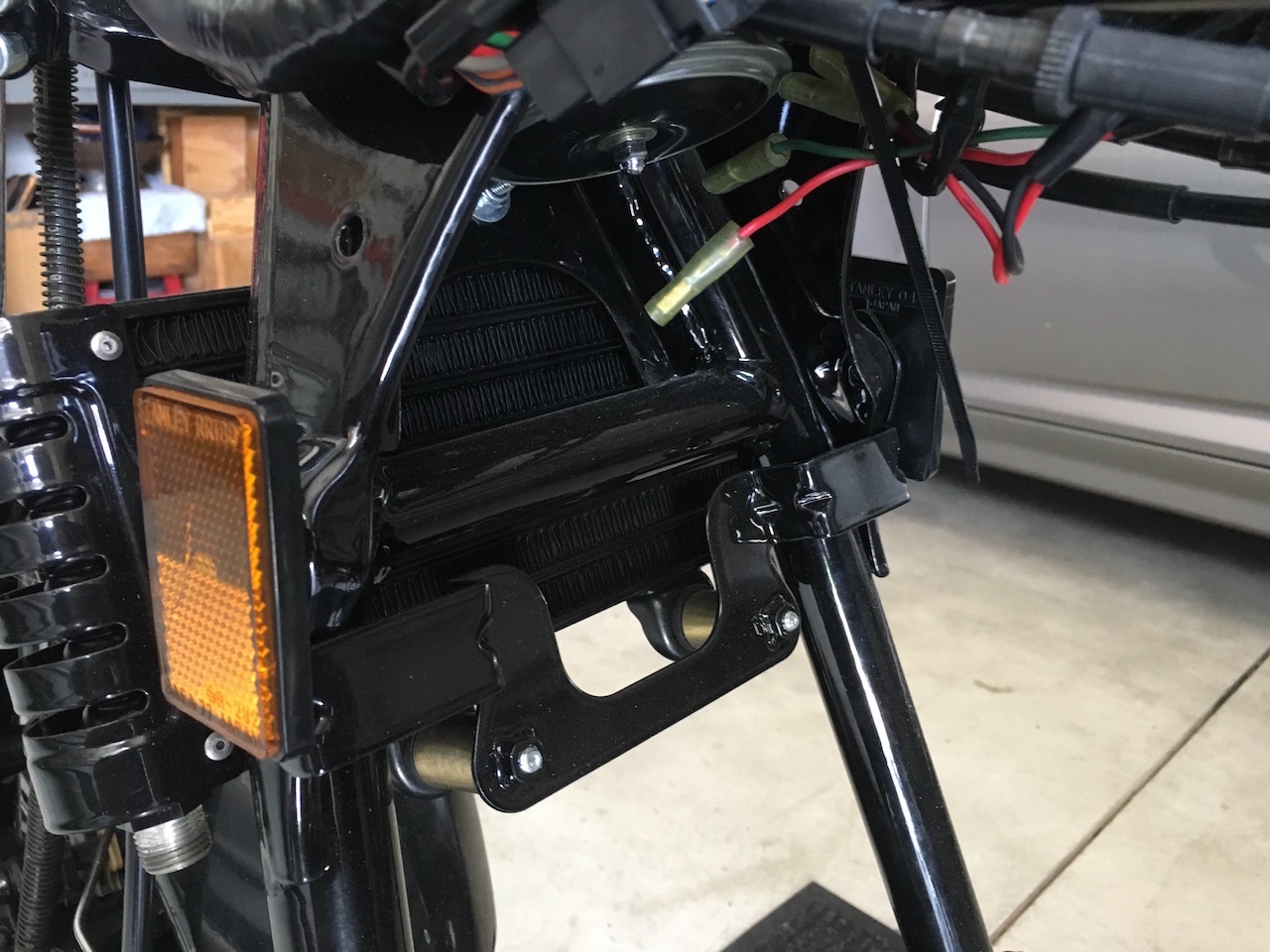 I used the zr550 oil cooler and mounted it below the horn mounting bolts and then used a combination of the original zr550 oil cooler mounting bracket and the kz750 reflector mounting ears for the lower mount.
