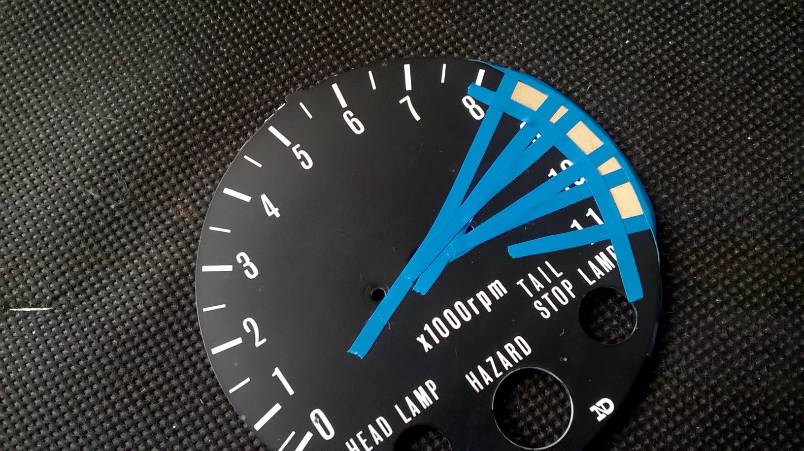 A day of failure and success today! :laugh: My mission at the moment is refurbing my instruments and one thing that has been bugging me is the tacho redline is now so sun faded it is a slightly whitey orange. Not very nice looking so I thought I would paint in some red to give it a new lease of life. What a cock up! I taped off the sections for painting and all looked good until I took the tape off. Bit of paint seepage under the tape. No biggie, I'll get some thinners and clean it off. It cleaned it off for sure, but also took the original black background and my 10 off too!!! :blink: Ooooops. From a distance (big distance) it looks okay but to be honest it really is a shit job so might just have to suck it up and buy a new tacho face.