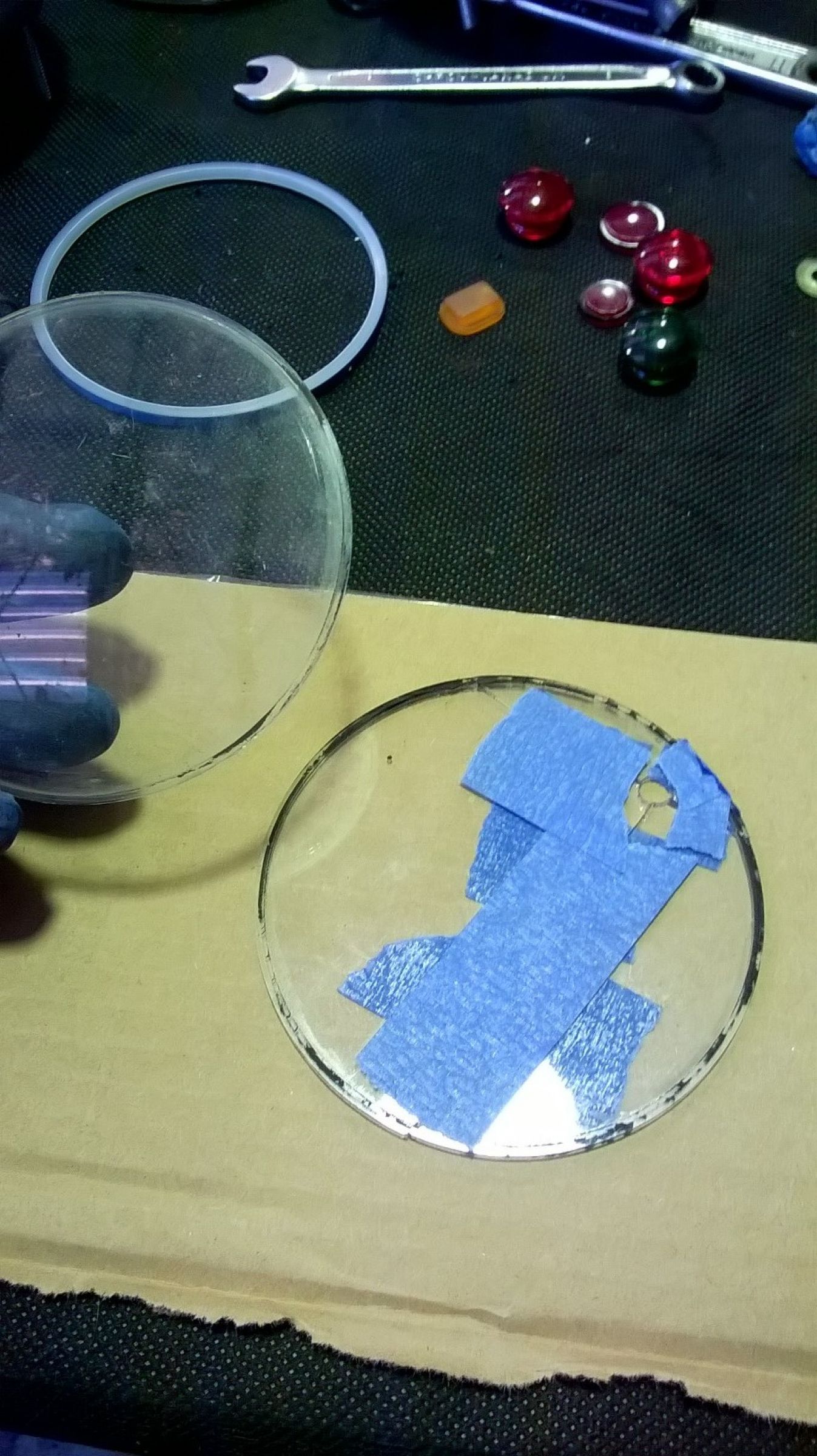 I made a carboard centre for my glass sandwich and taped the glass to be drilled to the old glass with carboard in the middle. Mainly to keep the drill bit from moving around and to get the hole in the right place.