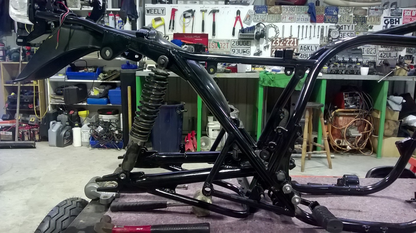 While I was on a role I thought I should get off my arse and fit the swingarm that has been sitting there looking at me for ages. Bam! It's in! Should have done that a while back but just been a bit busy with work and other peoples bikes lol. Have changed my mind about ten times on rear shocks and currently don't have a set. I would still like to go with a piggy back style shock and still pondering the best way to lay down the shocks a bit more but I will keep working on this one.