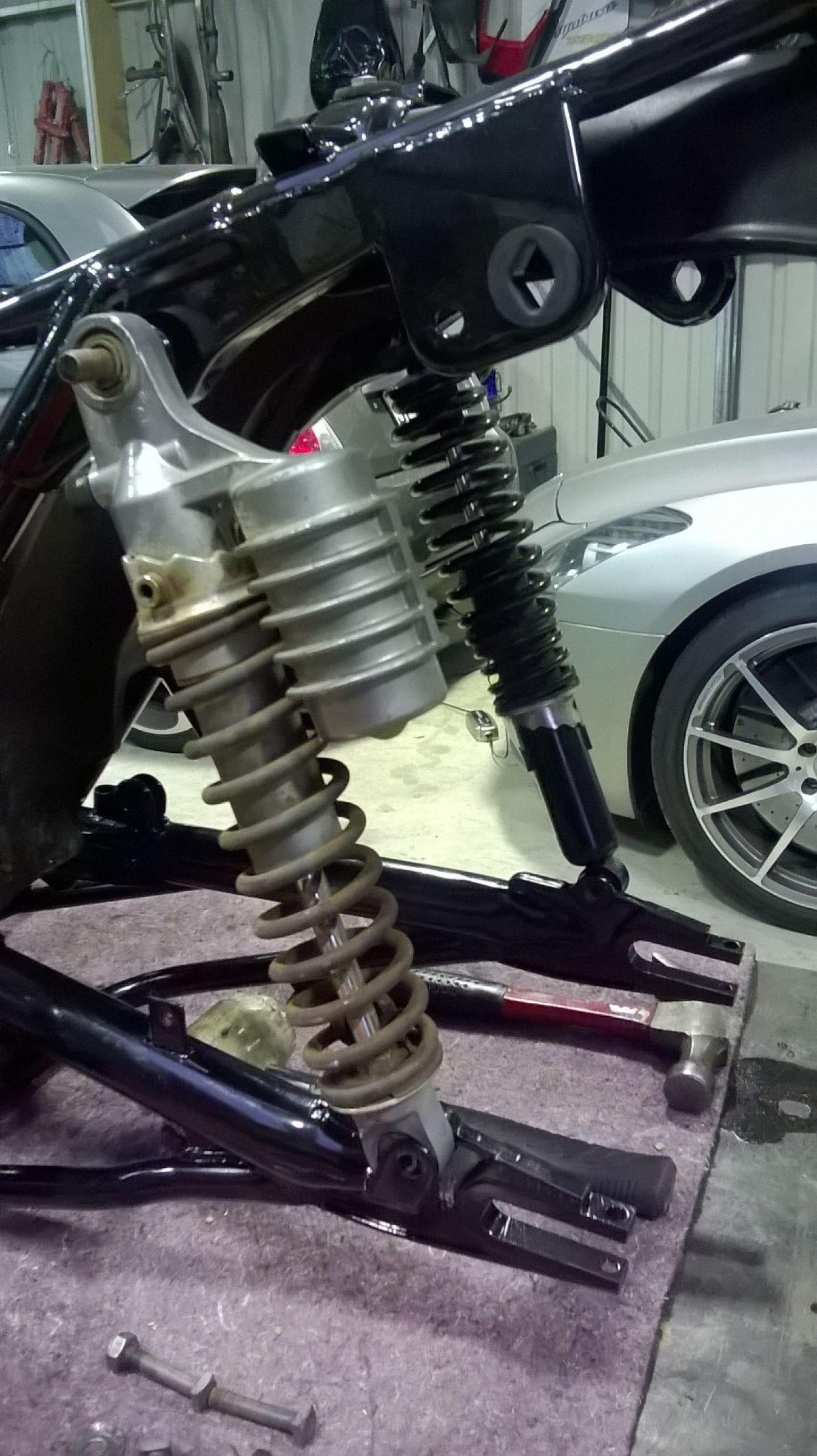 Still think I will do it by going backwards with a bracket off the rear of the swingarm. Not 100% yet but will get a bit more serious once I have the bike up on wheels.