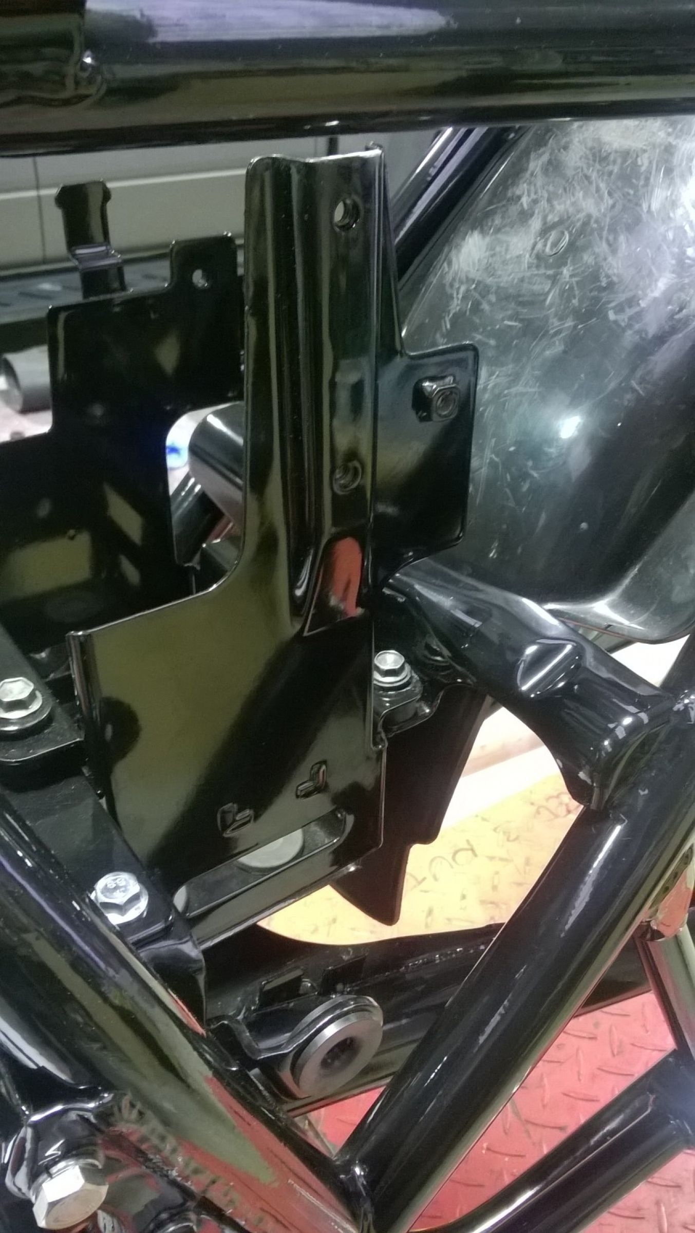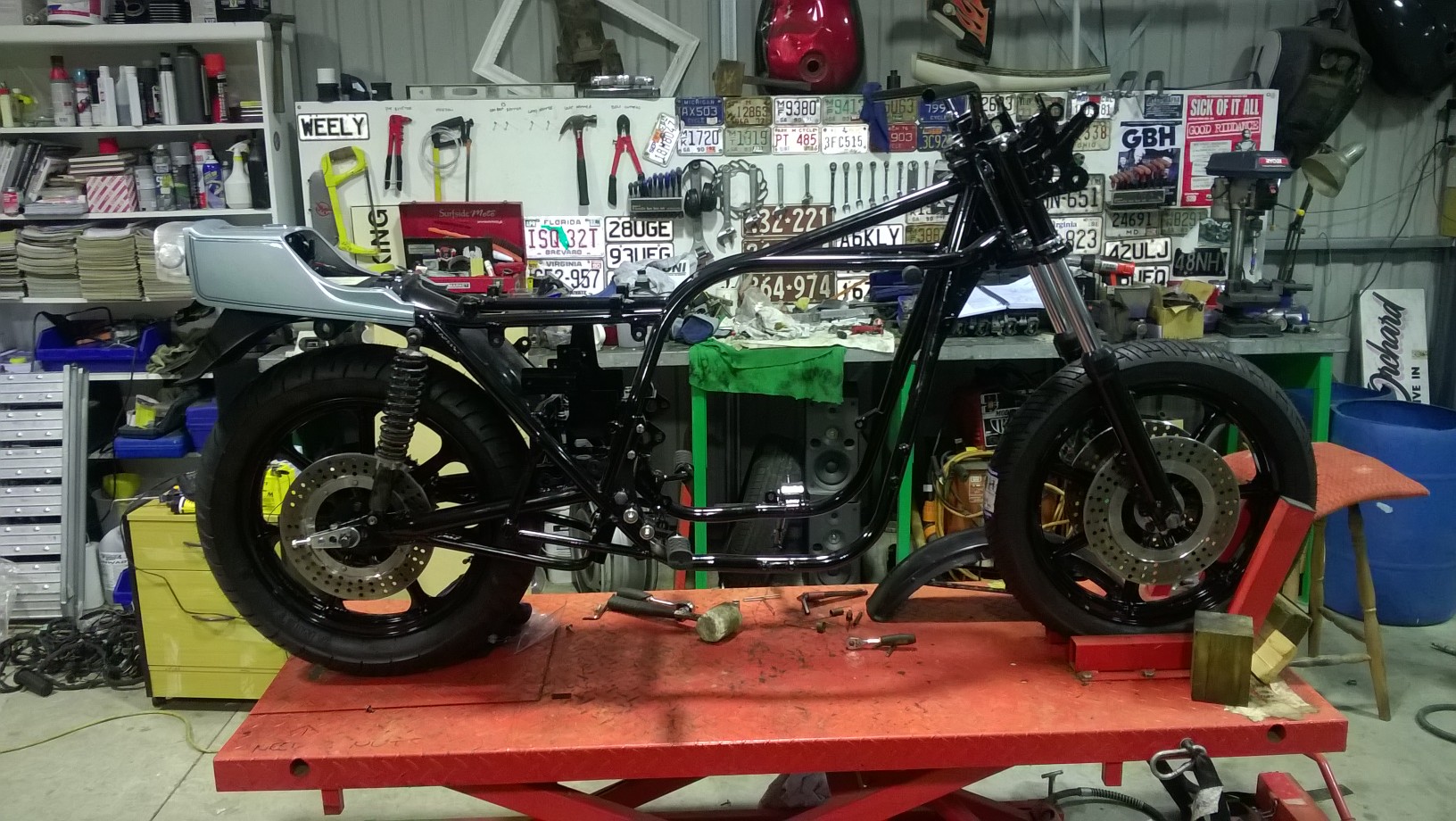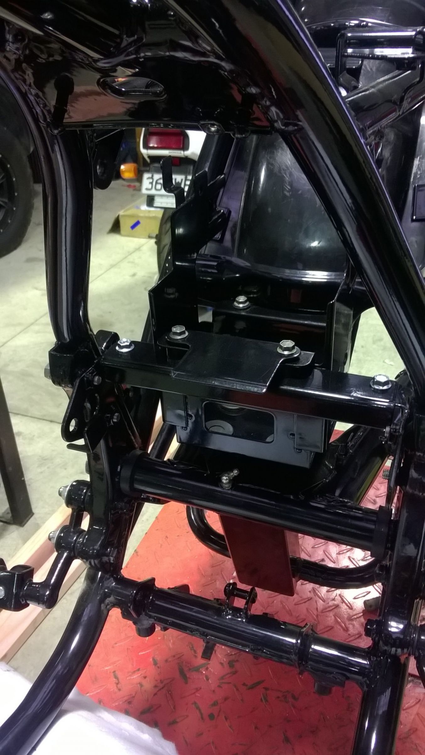 Righto, still waiting on bits for the brakes so thought it was high time I put the battery box back in. I know I say this in every thread but man I love new bolts! Put the box in and it fits sweet and looks good with new rubbers and powder coat. Only bummer is that I now realise I am missing three of the parts that make up the battery box! :blink: On the hunt now for the missing bits so if you by any chance have any of these bits hiding in your shed please let me know! Also got the wheel adjusters back from being replated and that meant I can put in the back wheel! Oh yeah baby!!!! Rolling chasis, just need to get the back caliper sorted and I can bolt it all up properly and call it done. Oh yeah, put the sidestand on to, can't have a rolling chasis without a stand can we. Only issue here is the I have lots of springs from my spring box but none that fit. Bugger, off to Ebay Germany to see if I can track down a set of German model side stand springs :S