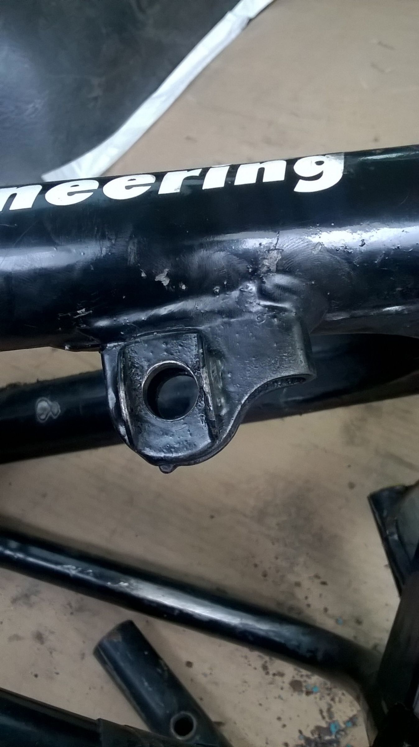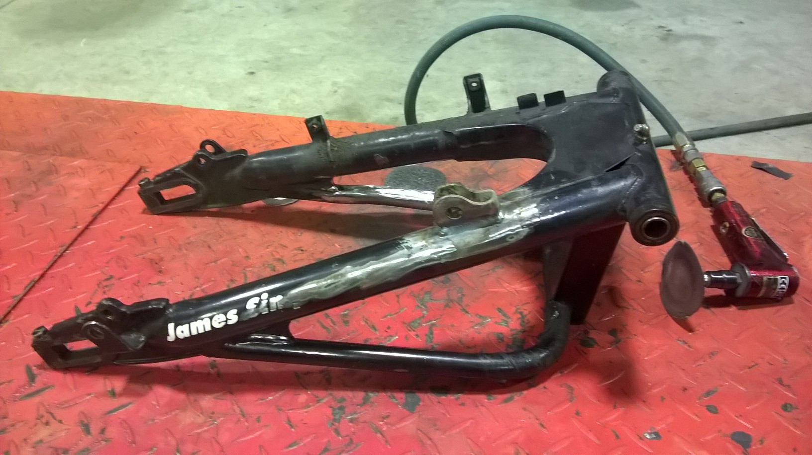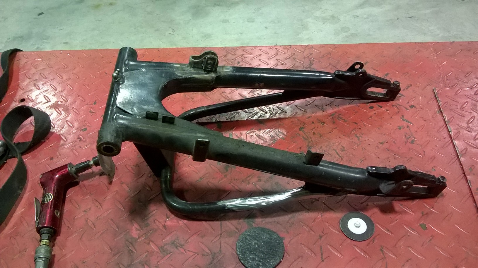 Okay, got into the swingarm over the last couple of days with the intention of stripping it to get ready for powder coating. Whilst standing around looking at it, it dawned on me that the brake stay bracket had been shifted and was mounted on the bottom of the swingarm. I got the swingarm off a guy that had a Z1000 race bike and must have been running an underslung brake setup. I pondered this for a while and came to the conclusion that I would like the bike to remain aesthetically similar as possible to (ish) as an original Z1R so the correct and proper thing to do is return it to standard (ish). Had to cut off the mount from the bottom, clean up the mess left behind, and then reattach it on the top. Job's tidy!
