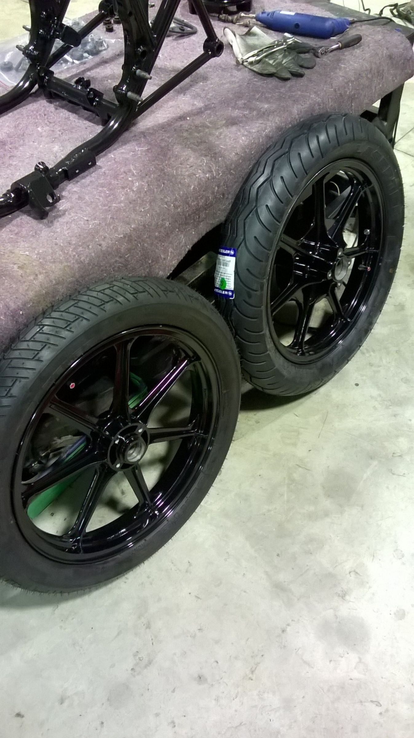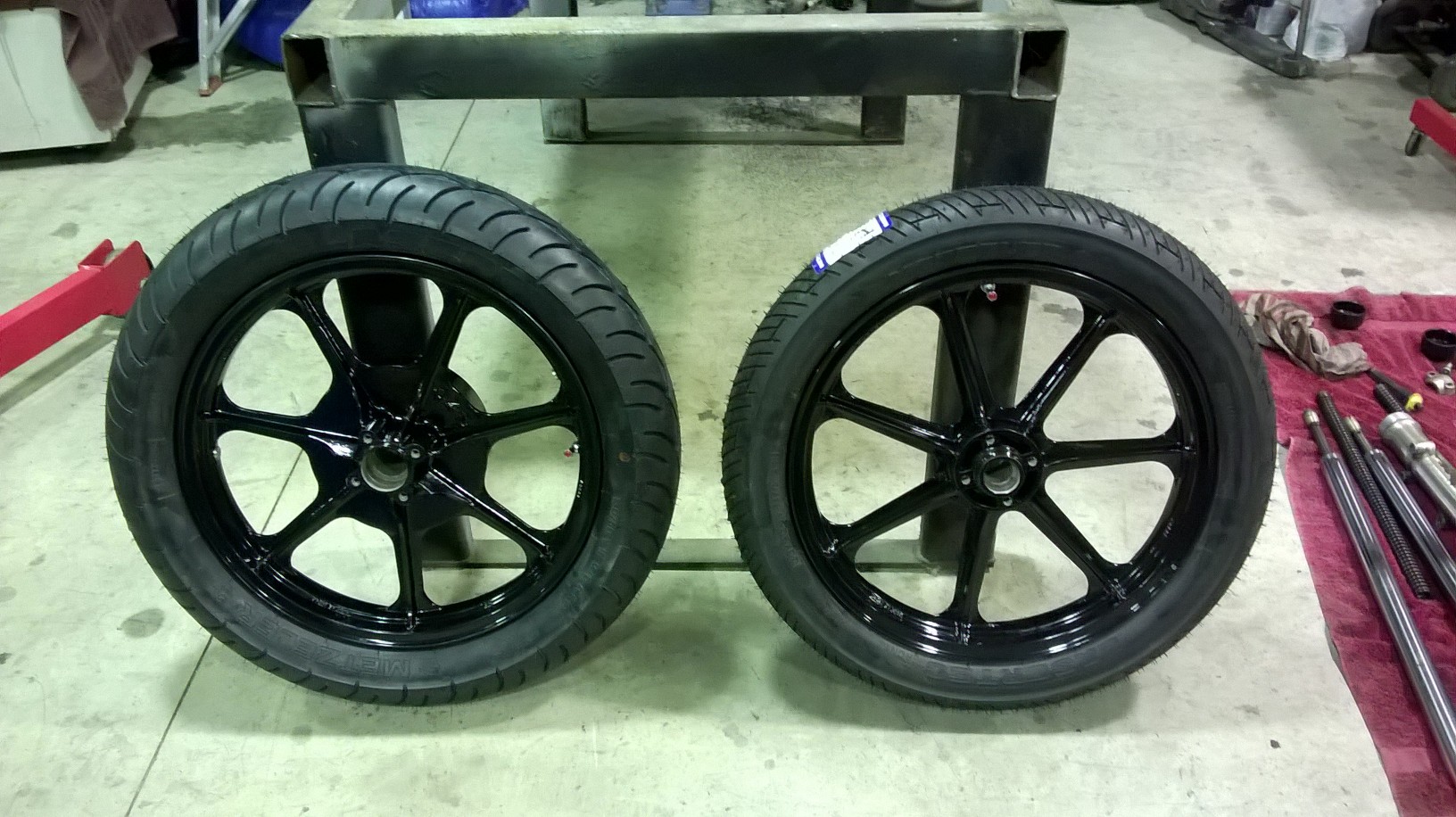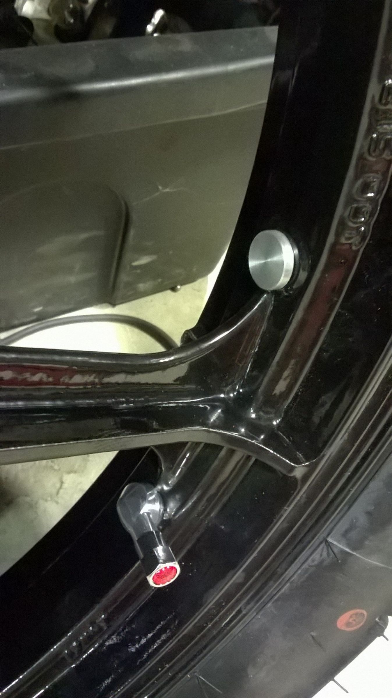 Got the freshly coated rims back with their new rubber on! Very stoked with the outcome, they look mint! Cool thing was a mate of mine machined up two bolt type bungs with rubber washers and blanked off the holes where the rim locks bolts exit from. I used Lasertec tubeless tyres and now the front and rear are running as a tubeless setup. Also, my mate that put the tyres on the rims for me used the glass beads inside the tyre for balancing. No ugly weights on the outside of my newly coated rims!