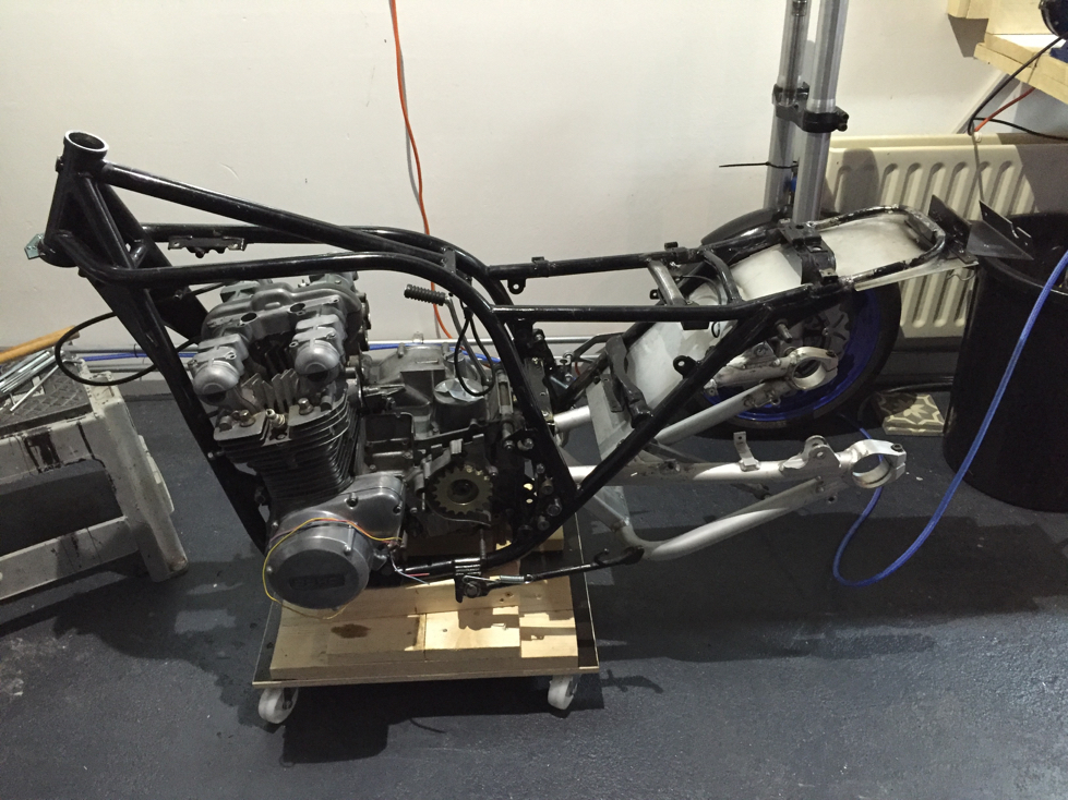 The Ohlins are a little longer than I hoped for and will be placed with an angle forward like all modern bikes.