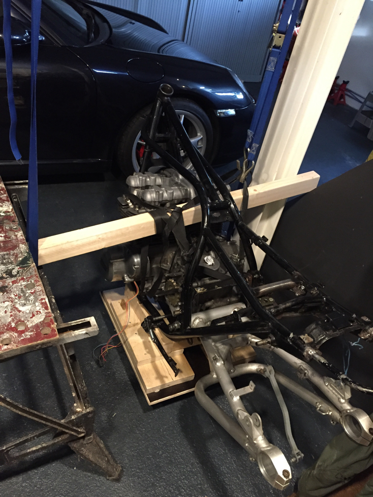 yeah if the front end and swingarm etc. is assembled on the frame it's not really feasible to put the frame over the engine .