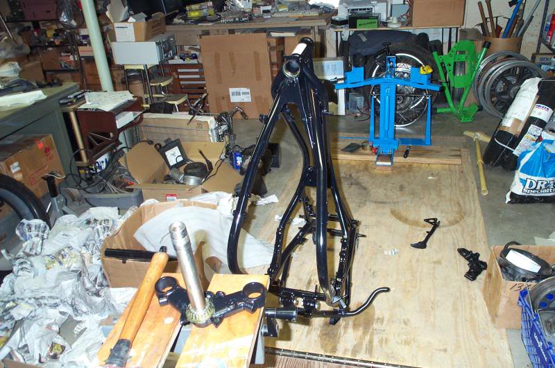 This is the '73 (late '72) Z-1, ser.# 0024xx. after we retrieved it from the seller in 2011. Seller had the frame painted himself years before we first saw it, intending to do the resto himself. It was done in epoxy enamel (we think), not powder coated, leaving the VIN tag intact. That's a nicely re-covered black foam seat in the background, along with a few of the boxes of parts. That's the correct cases for this frame.
