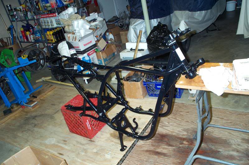 slmjim is now teetering around on his freshly-hacked spine. Work on the bike is proceeding nicely, with kneepads making it possible to reach the lower portions of the bike. slmjim has come to terms with kneeling at the totem of a basket case Z-1 to work on it and, too, kneeling in the presence of The Lovely Z1BEBE, much to her amusement when she deems it appropriate to honor him by venturing into the service bay. Hilarity ensues and, occasionally, boy/girl-type stuff :woohoo: .