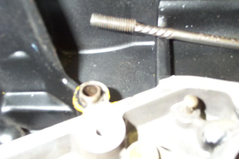 With the dowel out and MMF merrily boiling away inside the hole, the easy out was inserted and started gentle twisting commenced. At first It seemed too easy, as if the easy out out was just spinning in it's hole, and that perhaps the hole had been drilled too large, but then we realized the easy out was rising out of the hole. The bolt piece was just easily unscrewing! It seemed too easy & too simple, but soon the offending piece was out. This was taken after the dowel had been replaced, showing how much bolt was left in the hole.