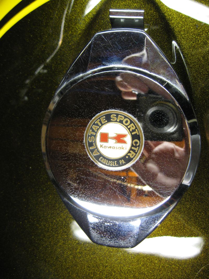 The only presentable gas cap we had has a metal, embossed Kawasaki dealer emblem attached to it. Hard to see in this pic. Dealer is Allstate Sport Center in Carlisle, Pennsylvania. Kinda' cool, and harks back to the period.