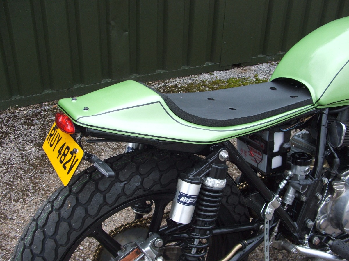 Tank and seat unit sprayed in pearlescent Kawasaki green.