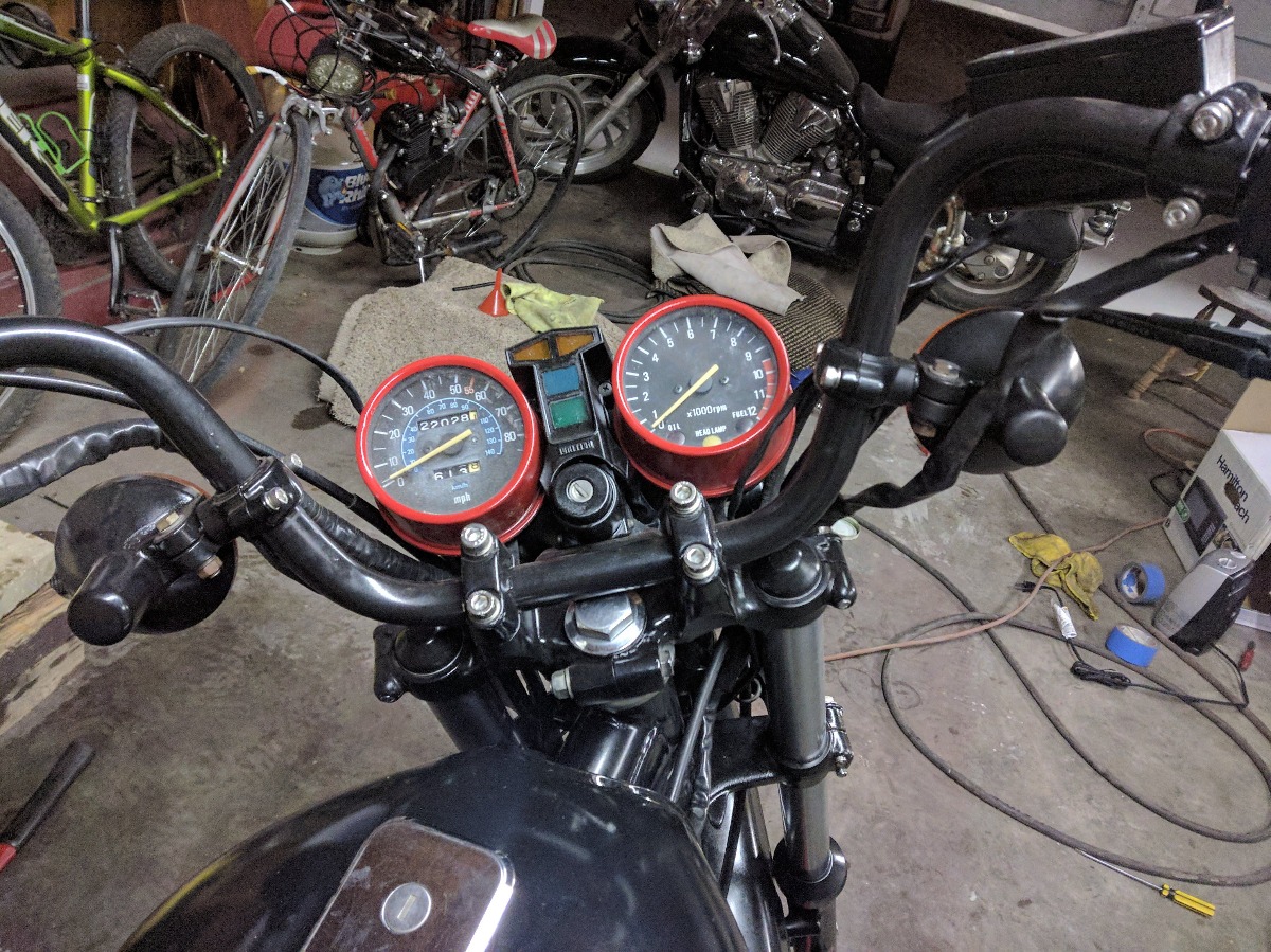 Installed the new chain, They had a red one so why not eh? Had to cut out two links and steal the masterlink from the old chain. This is a stock kz550 ltd replacement chain/sprocket set and will give me a bit higher top speed due to the 650 gearing.