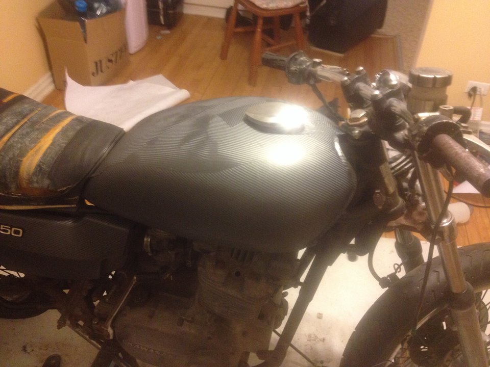 ive done a bit more to the bike, the tank wrap looked like crap so i pulled it off then gave it a quick spray with gun metal grey paint