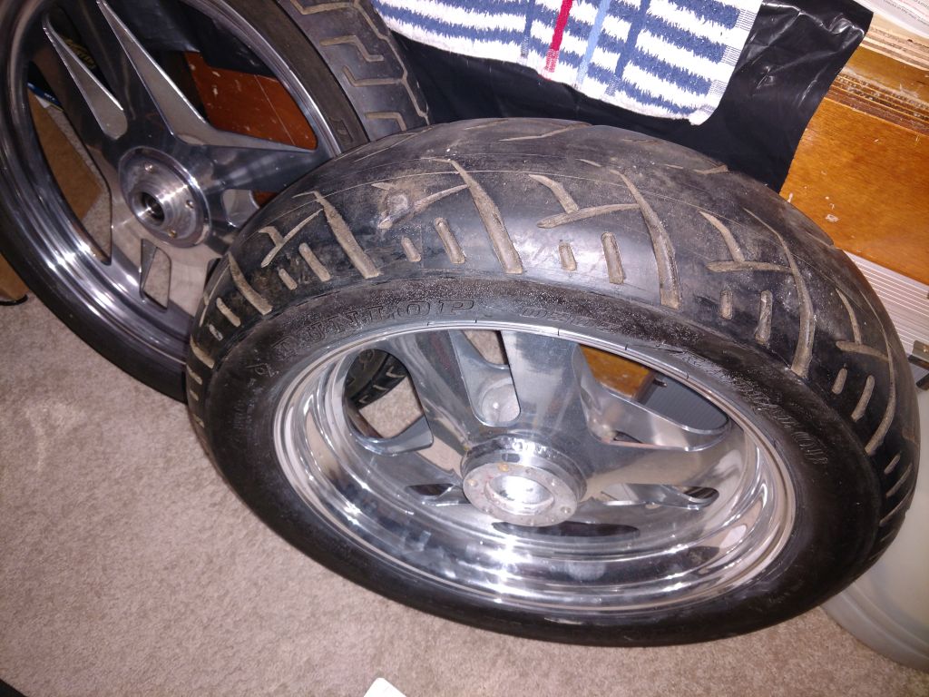 So while I try to figure out how to mount the rear sets, I am going forward with other parts of the project. I finally found a rear rim, its an 18" X 6.5 so now I mounted a 200. The old tire was a 160 with a couple of plugs in it.