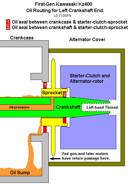 The oil comes in through the crankshaft. The crankshaft has a small hole on the starter-clutch-sprocket bearing surface, then is supposed to seep back into the crankcase along the outside of the crank, but inside the starter-clutch-sprocket bearing. There are two seals involved. One seal is in the starter-clutch-sprocket between the starter clutch and the crankshaft. The other seal involved is in the crankcase between the crankcase and the starter-clutch-sprocket. If either one leaks you will get oil in the alternator cover. I think the starter-clutch-sprocket seal may be more important for keeping out oil because that one has to hold oil pressure.