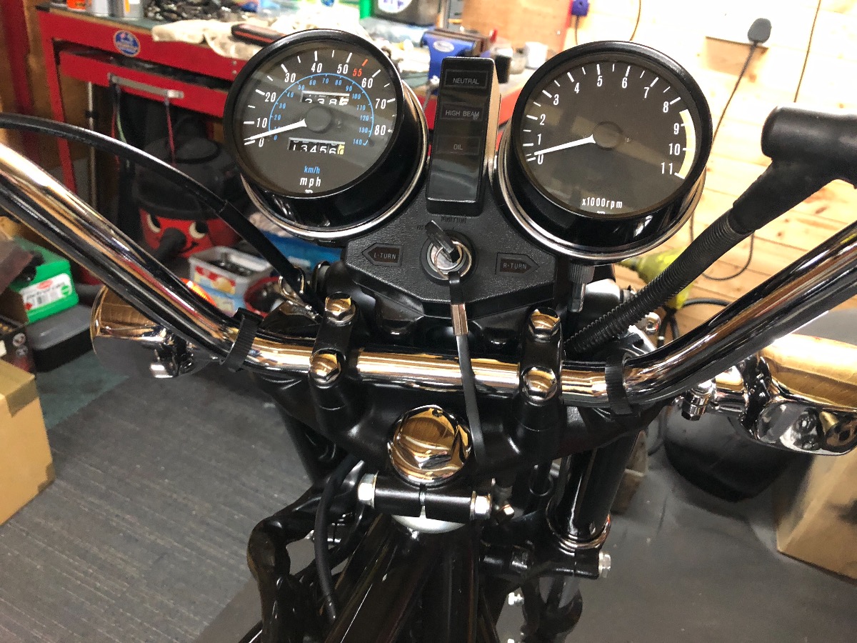 Engine & frame repainted, lots of chrome replating, wheels off to be refurbished, carbs being stripped/rebuilt.