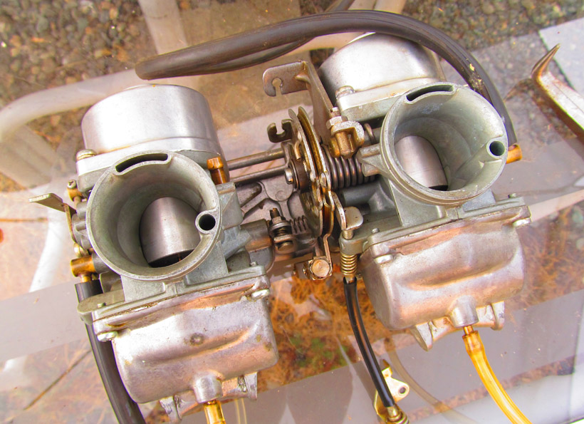 This one came to me with the pod filters in a cardboard box, and a couple plastic grocery bags stuffed into the carbs to keep dirt out. I was quite glad to finally get rid of the plastic bags.