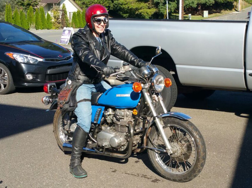 So excited to actually get to ride it! Still needs some work. The bike won't idle below 3,000rpm or so, and I can feel it 'surging' even in 3rd. It also leaks quite a lot of oil from side covers on the engine. (Note the wet spot under me in the photo). I have a full set of new gaskets for the engine, I'm hoping that replacing the gaskets for the engine covers will fix that. (We have to pull the covers off anyway. A previous owner punched a hole in right side one with the rear-brake lever and welded it back up, so I have a nice clean replacement off the parts bike that needs to go on. Plus, we need to figure out why the electric starter won't work). There's also a short somewhere in the electric system, probably because the guy I bought it from re-wired the bike (and admitted he doesn't know much about wiring). If you wiggle the bundle of wires behind the headlight, you can get all the power to cut and then come back. So that'll be an issue to track down.