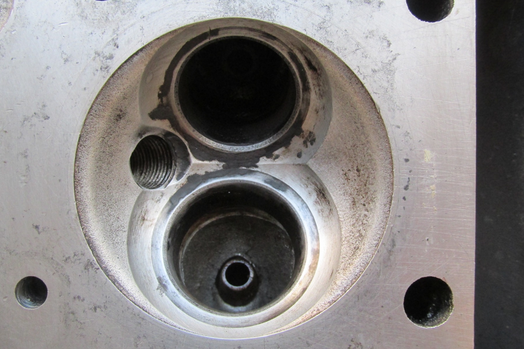 Fortunately, the parts bike gave me a good cylinder head (the entire lower end of that engine is a solid block of rust, but the top end was still in decent shape despite sitting out in the weather for years.) Well, a filthy cylinder head, but one with good spark plug threads.