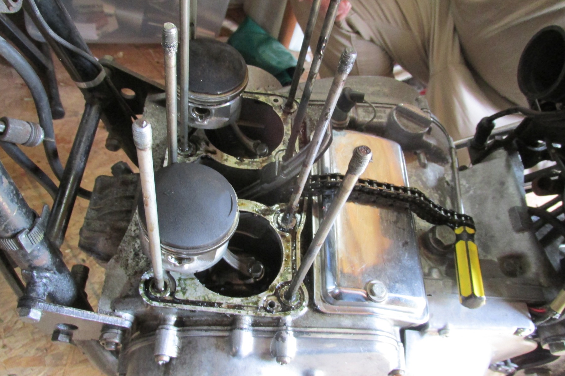 Happily, the cylinders look to be in quite good shape. The pistons are also nice, with only a thin layer of black carbon on top that easily scraped off.