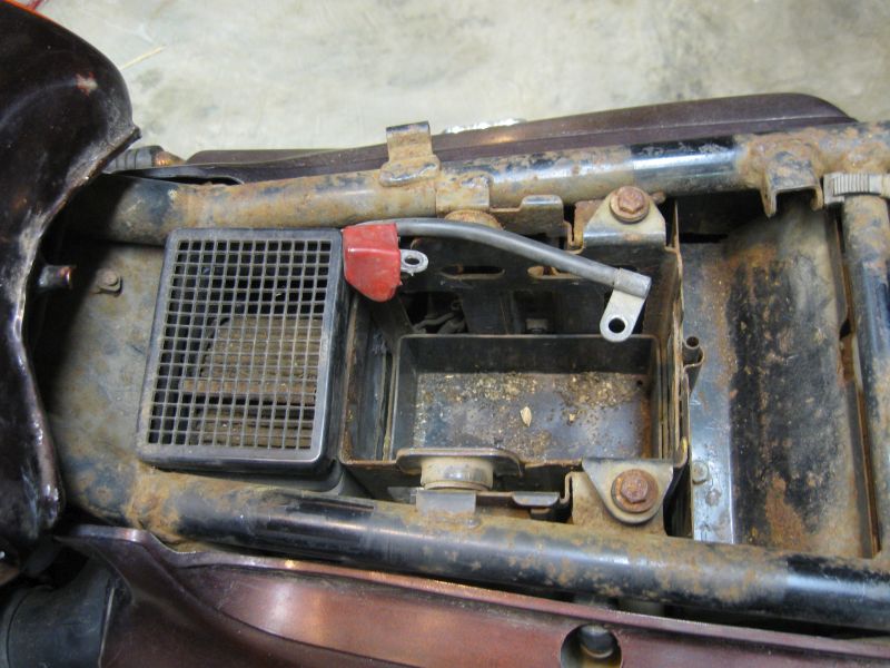 We're really sorta speechless regarding how good the internal tank condition is! I don't have a way to get good pics of the lower rear corners of the tank, but a long, flexible bore light reveals surfaces almost as clean. No loose rust at all! Looks like a fine candidate for gentle electrolytic rust removal with a 12V battery charger and washing soda.