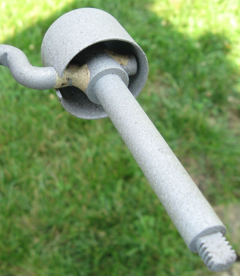 Note that the above is the the later, riveted construction wherein the shaft end is riveted to the cup. The earlier latch shaft ends were brazed to the cup as well as the levers, as seen in the pic below. Brazed one sans rivet on the left, circa. ser# low 2300's (late '72 mfgr. date), from "the Seven Year _itch", a basket case we completed a couple years ago. One on he right is an example of another riveted assembly. Don't know when the change was made, date or ser.#, from braze to rivet.