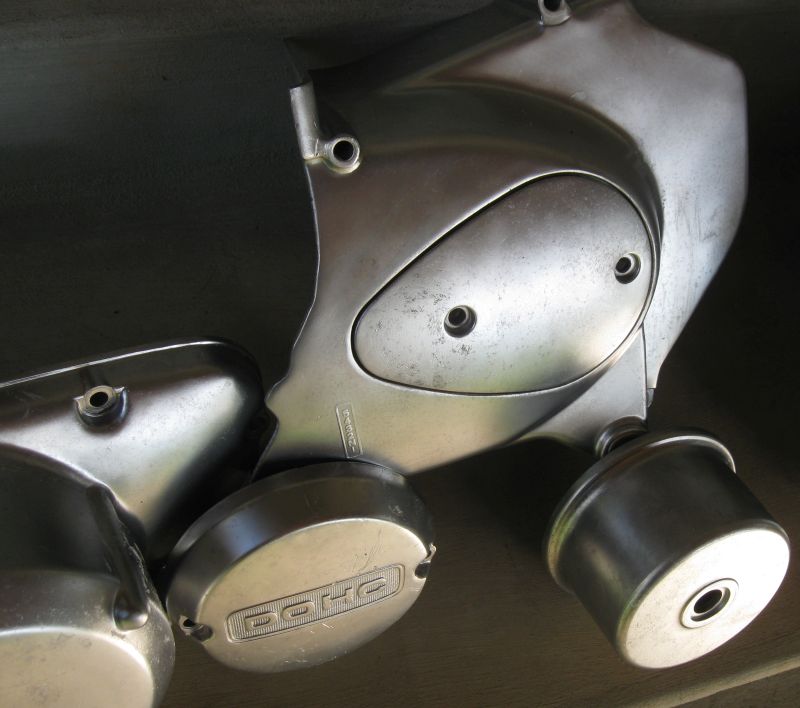 We've already established that over three decades of inactivity in a PNW barn was not kind to the finishes of this bike. The before pics at the beginning of this thread are representative of the painted finishes. Below are some before pics of the polished aluminum after bulk chemical degreasing outside with de-greaser and a hose to get them clean enough to go in the parts washer. They're cleaner than they look. What's left is very stubborn creeping-crud corrosion and the resulting pitting. After these pics, final washing in the parts washer, and finish washing with strong detergent & water was done to prep them for vapor blast.