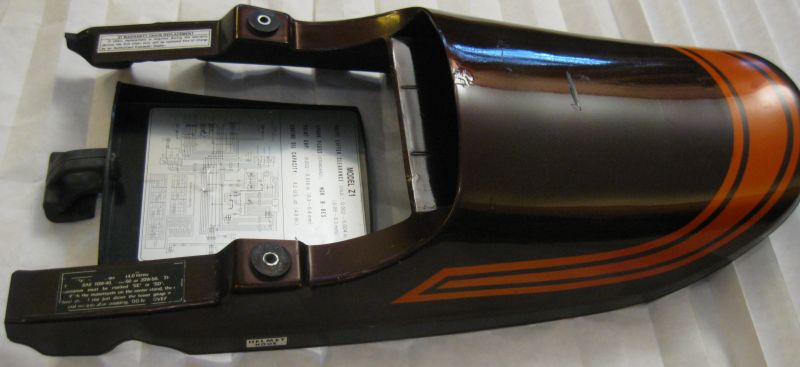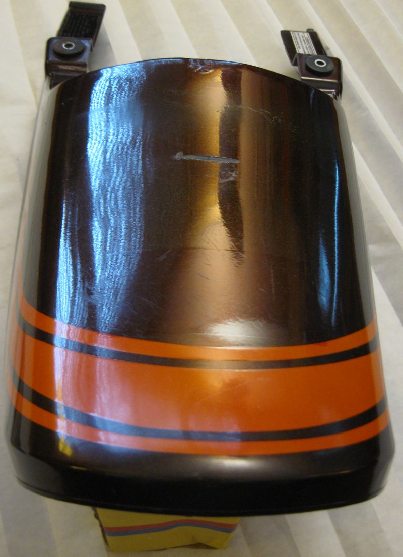 We'd like to invite whoever applied the dealer sticker directly to the top of the tailpiece ~47 yrs. ago to take a lonnnggg run on a short pier. 90 minutes with a hair dryer and sharpened plastic scraper got it off, but not without leaving a few scuffs behind. The leftover adhesive required another 30 min. to fully remove using as gentle a solvent (you don't wanna know...) as would have any effect. The area covered by the sticker was not faded, compared to the surrounding areas as would be expected, and is fairly noticeable The under-sticker area could be a good reference for color & flake of a late-production '73, as would the bottoms of the sidecovers & underneath the tank.