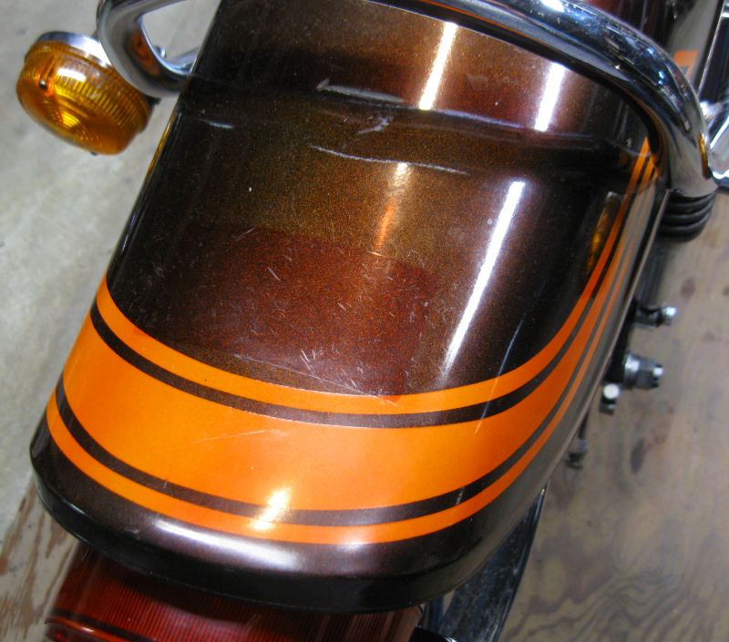 After Z1BEBE devotes around 24 hrs of concentrated hand effort spread over a week or so using white polishing compound, followed by a mix of pulverized blue jewelers rouge (Bleu Rouge) suspended in Murphy's Oil Soap, then a final buff with finishing polish/UV protectant, and the old factory paint really comes back with a vengeance. It was such a stroke of good fortune that the bike was in a barn for 30+ years! The only sun fading of note is on the right sidecover that apparently face a window.