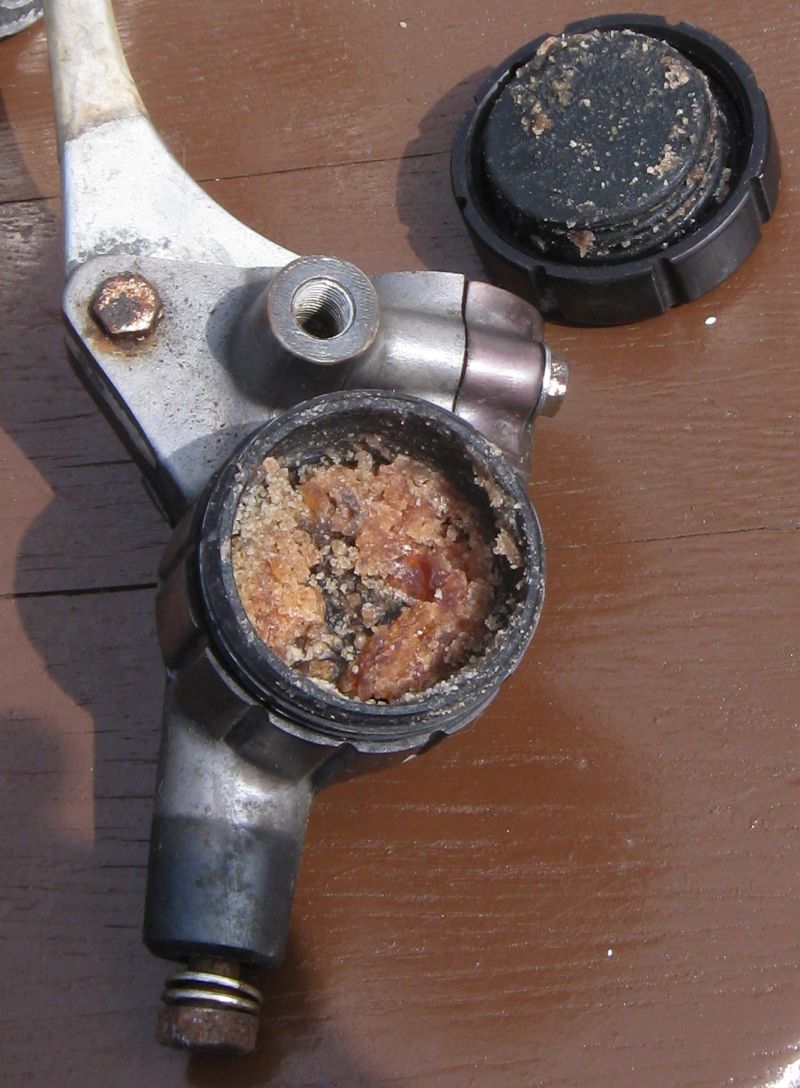 Don't know what the nasty creeping crud is that once was DOT 3 brake fluid. We've seen it many times but, never this much in one place. It's usually green-ish, but this has finely aged to calming. tan & brown earth tones :dry: . There was a shot glass full of the stuff in the MC. Piston is seized tight. It's unlikely the bore can be salvaged, but we'll make that call when we gently coax the piston out using a combination of friendly persuasion, heat & a 20 ton press.
