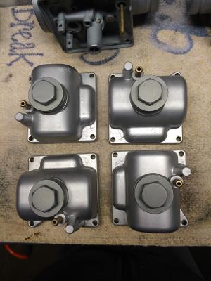 Disassembly & time spent in the parts wash tank, then in the ultrasonic tank indicated the patina would be uneven enough from carb body to carb body to be noticeable, and not at all in keeping with the cosmetics of the motor & other aluminum in general. It was especially evident on the top caps and polished sides of the #1 and #4 float bowls. So, right or wrong, we decided to blast everything. The results are acceptable, but too bright to be correct. Don't know if we'll ever vapor blast carbs again though, because even after rinsing in detergent water along with strong water flow & compressed air, the remaining glass bead is a cross between a pain in the a$$ and a SOB to remove completely. It seems as if bead is held onto surfaces by electrostatic attraction or surface tension somehow. A solution of an industrial detergent in the ultrasonic tank finally remove 99.9% of the bead. These puppies are clean!