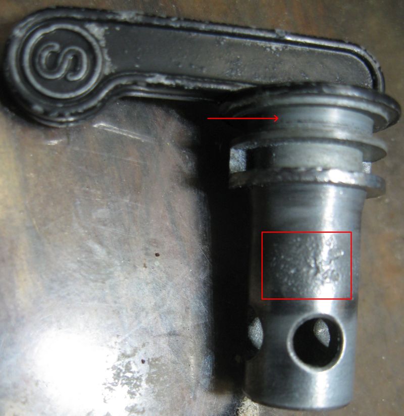 Red arrow shows groove for the O-ring introduced not long after production commenced. The red square shows the pitting.