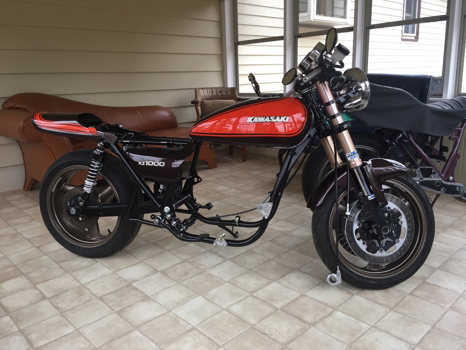 Very cool. We might convert to handle bars later but as of now everything fits too nice to bother. I believe the cases are powder coated or painted, I forget which. Frame is satin black and paint is the kz900 brown and orange.