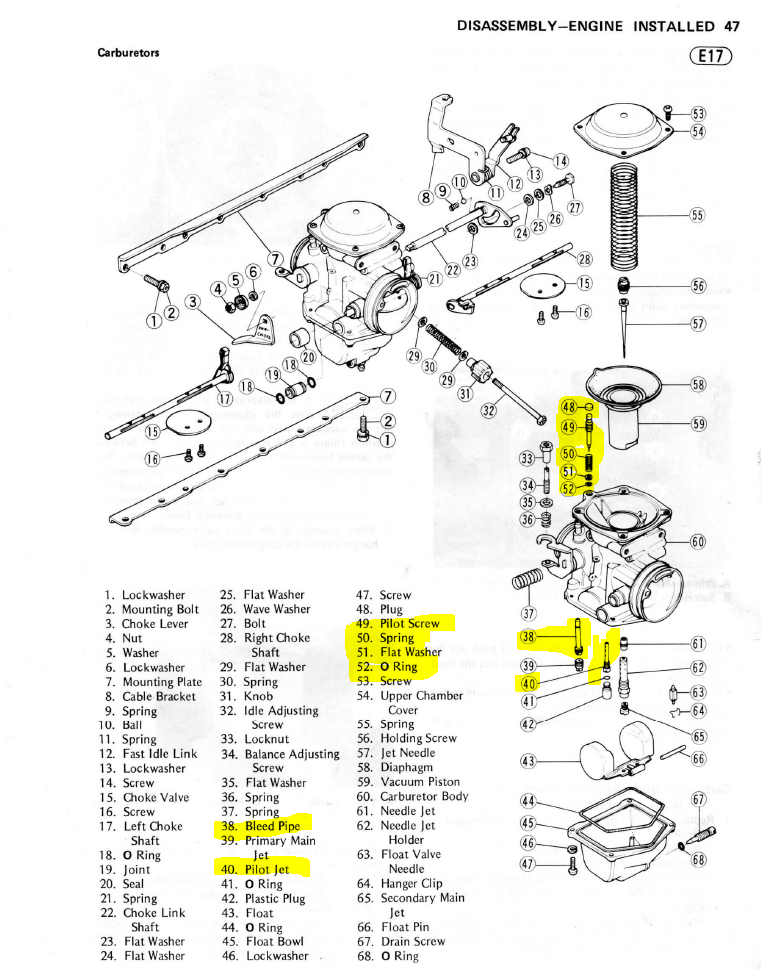 16 Jun 2019 21:20 - 16 Jun 2019 21:25Nessism wrote: Like I mentioned earlier, you have to remove the pilots, bleed pipes, pilot screws (and spring, washer, and O-ring) and clean all the parts and passages. Light must pass through the pilots and bleed pipes or the bike won't run right if at all. You can NOT clean these parts and passages by shooting stuff through the carbs.