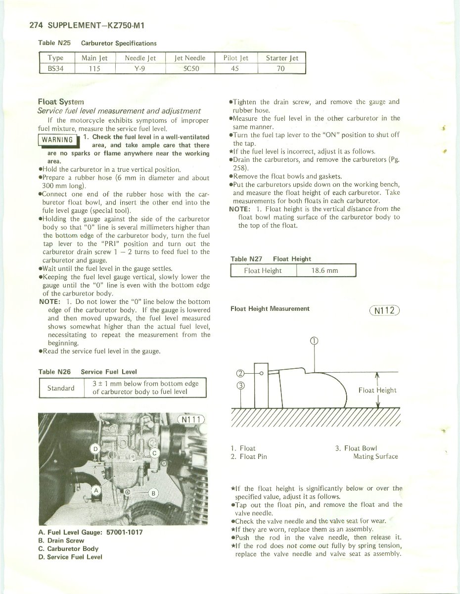 yeah, yep. thanks Scirocco. Problem is I did the float height check my manual called for the first time I reassembled them. Since then I only recently monkeyed with the tang. This is why I'm so perplexed. And also, regardless of fuel height wouldn't the cylinder be firing anyhow even with a lean mixture? It has compression (129), it has fire, evidently is does not have fuel and I'm lost at this point. I'm a pro at pulling the carbs and breaking them down. I just suck at making them work.