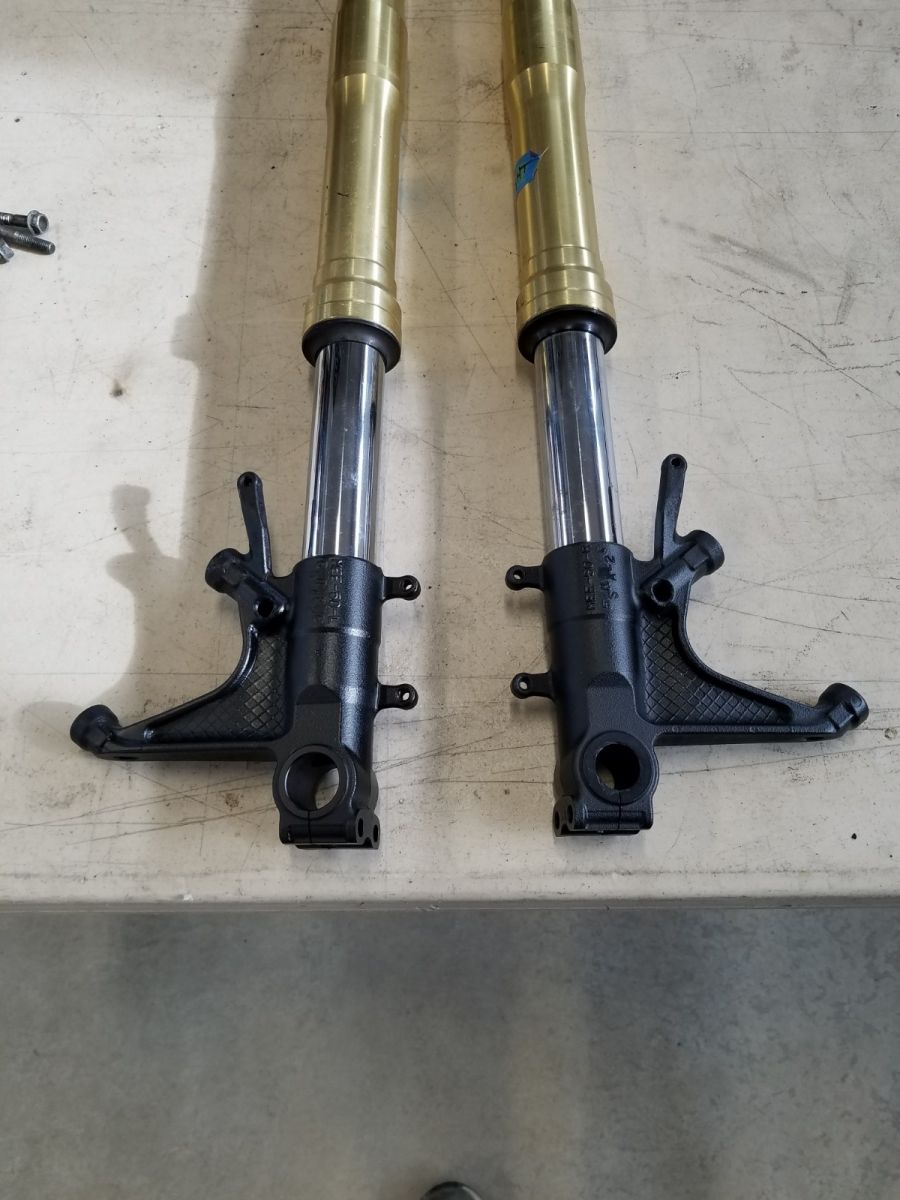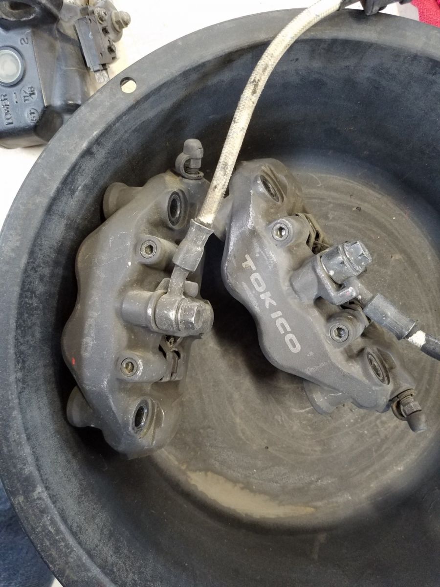 I've been working on the brakes (obviously), and cleaning/refinishing as I go along. I bead blasted the rear caliper mount. Going to repaint it semigloss black. I also repainted the fork lowers.