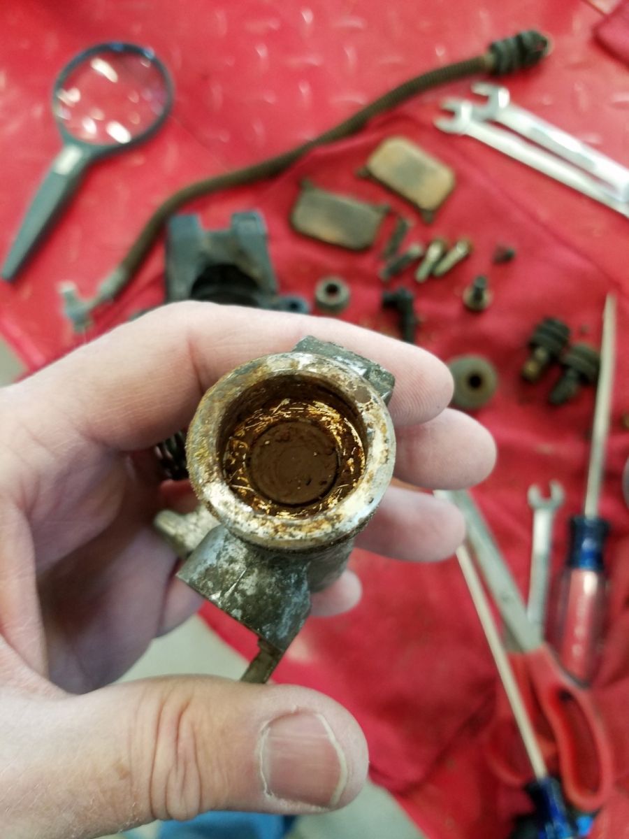 The rear master cylinder has a frozen piston as well. So for lunch today, I am whipping up a batch of caliper soup on my shop stove. Once I get the pistons out, I will decide if they have to be replaced or not. At least the front brakes are only 15 years old and still have fluid in them.