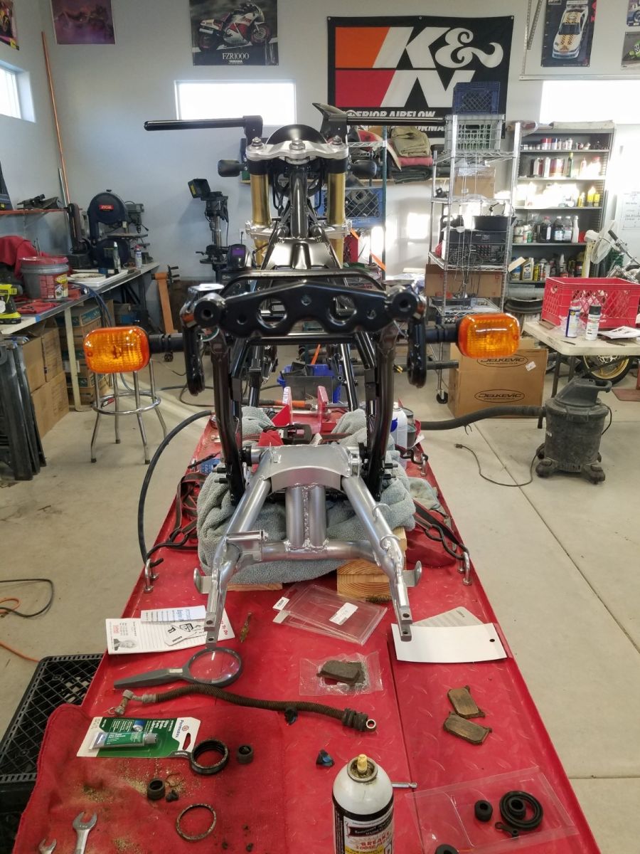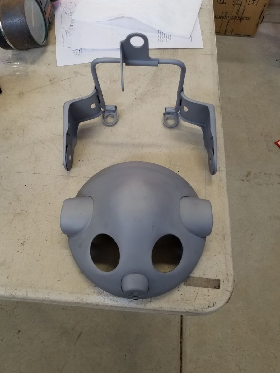 While waiting for the rear caliper rebuild kit to arrive, I switched over to the front end. I need to design my own headlight/inst. mount, mating the Kawi parts to the Honda upperfork clamp. Since I plan on using the stock headlight and most of the mounting bracket, it was back into the blast cabinet.