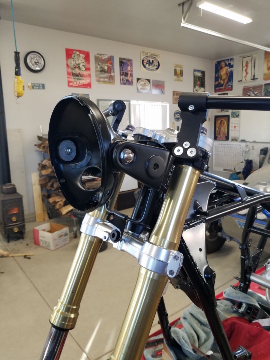 Now the headlight bucket is mounted, I can't get the guage cluster to fit. More welding will be required (scratching head)! I still need to add a bracket to the lower fork clamp as well.