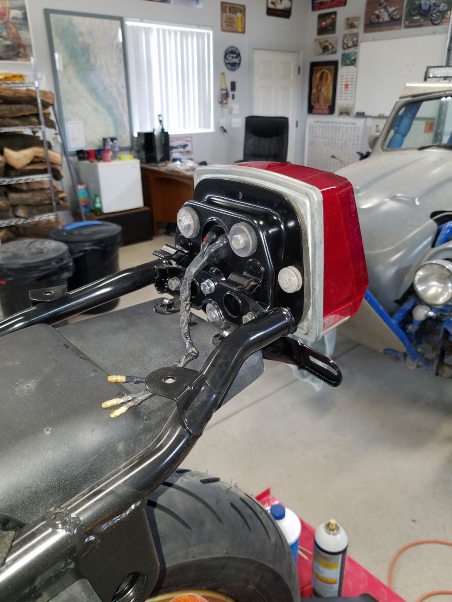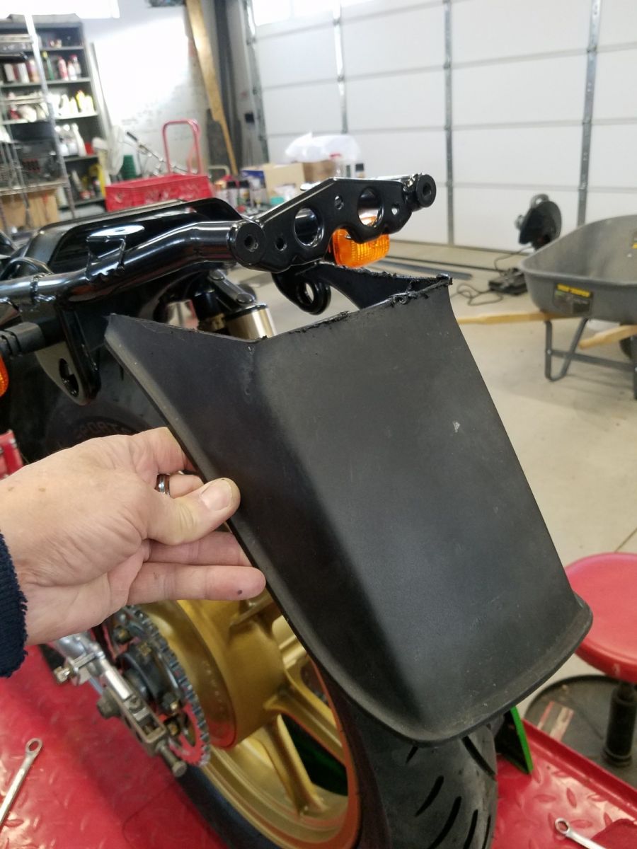 Working on the tail end today. Took apart the tail light and blasted all the rusty parts. I decided to clean and fit the rear fender back up. It didn't take long to decide the rear fender needed a serious trim job!