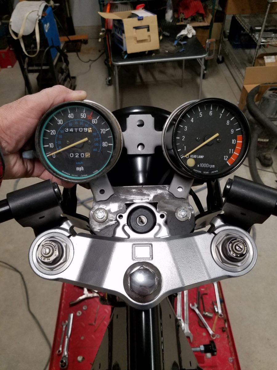 I still need to finish the gauge cluster mount, but I think I have to have the new speedometer before I can finalize the design. Since I went with a modern front end, it is no longer able to cable drive the stock speedometer. The Honda used an electronic sender off the motor for its speedometer. I have been searching the internet for a GPS speedometer, but most are set up to mount into a panel (dashboard). Another issue I am finding is very few actually show the back of the gauge they are selling. I would like to try and reduce or eliminate the need to make a decorative bezel to house the new gauge, while getting a face that looks decent next to the stock tachometer. Really not having much luck in this regard. It would be really nice to look at and hold one prior to purchasing, but I live in an area that does not have any retailers carrying these type of parts. On top of that, the nearest motorcycle salvage yard is 3 hours away and in another state.