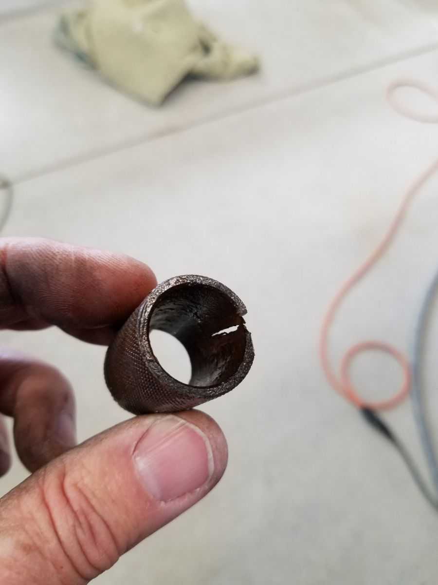 Another small success! I was able to remove the brake shaft without damaging the OD of the shaft. I had to break the bushing out of the aluminum bracket, then cut through the bushing with a grinder and cut off wheel. I had to make sure not to cut all the way through, then use a chisel in the cut groove to finally crack the bushing. Using penetrating oil in the crack, I got the bushing to turn, eventually working it all the way off. After soaking it for a few days in the rust treatment, I will polish the shaft. Now I can replace the stock rear footpeg bracket with a used one that doesn't have the brake shaft. Yay!